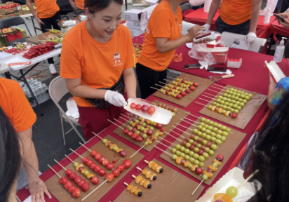 When you first walk in the festival, you will be greeted by the countless different cuisine booths ranging from sweet pastries like blossom cakes or 桃花酥, to savory noodles and street food. With food being such a big part of Chinese culture, it is without a doubt a big portion of the festival with many people visiting because of the cuisines. Having interviewed several people, it came to my attention that almost all of them mentioned the food when asked about the festival. One said “I think the food made me want to come” also mentioning that the traditional Beijing dish, Peking duck, tasted pretty good which I can agree on because I tried it as well. Other popular foods amongst visitors included the traditional Chinese sweet Tanghulu (冰糖葫芦 in Chinese), and Chinese crepes better known as 煎饼馃子. When asking visitors what their favorite foods were that they tried, two responded with Tanghulu. This makes sense as Tanghulu is a really popular street food bought all over China. Besides those, there was also booths selling boba milk tea, ice jelly, fried and hand pulled soup noodles, meat sandwiches (肉夹馍), and more.